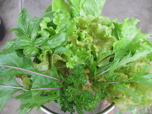 そして翌朝は、ベランダで採れたサラダ菜と玉ねぎいっぱいの